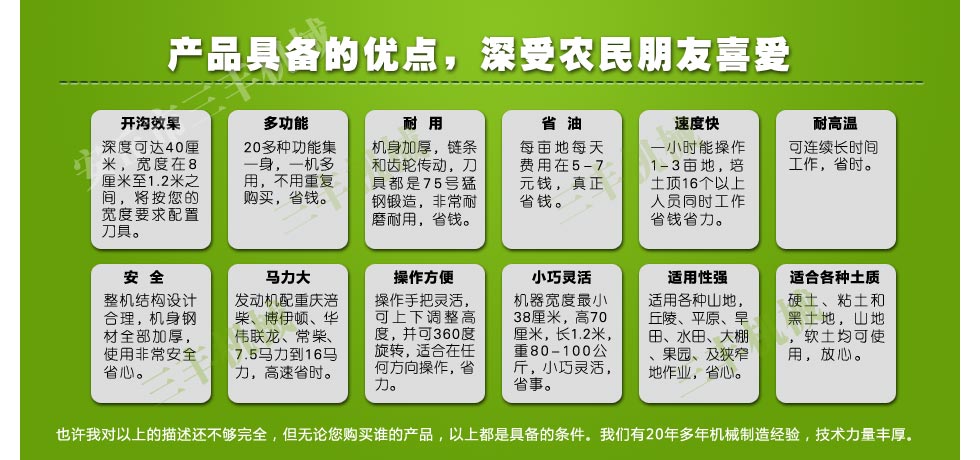 已發展成為國內規模實力專業實力的機械設備廠家,田 園管理機在工廠發展壯大的29年里,我們始終為客戶提供好的產品和技術支持、健全的售后服務。"創新——誠信"為核心